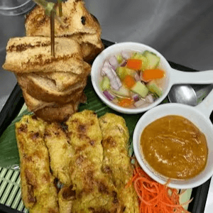 4 sticks. Chicken barbecued Thai style, baked bread, served with peanut sauce
