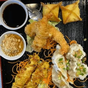 2 chicken satay, 2 dumplings, 2 gyoza, 2 krab rangoons, 2 banging shrimp