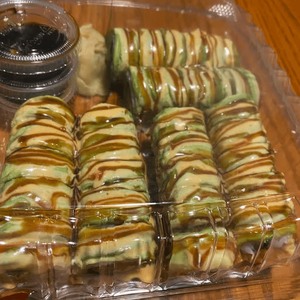 Imitation krab, avocado, wrapped in cucumber topped with sweet vinegar