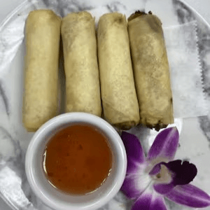 Fried. 4 spring rolls, homemade mixed vegetables, clear noodles, and ground chicken