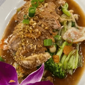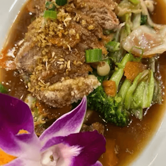 Stir fried fresh garlic, chili, onion, bell peppers, carrot, bamboo, eggplant, fresh basil in a light brown sauce. Available Monday to Saturday from 11:00 AM to 3:00 PM.