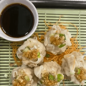 4 pieces. Chicken mince and mushrooms wrapped with wonton skin and steamed, garlic oil and scallions served with homemade dumpling sauce