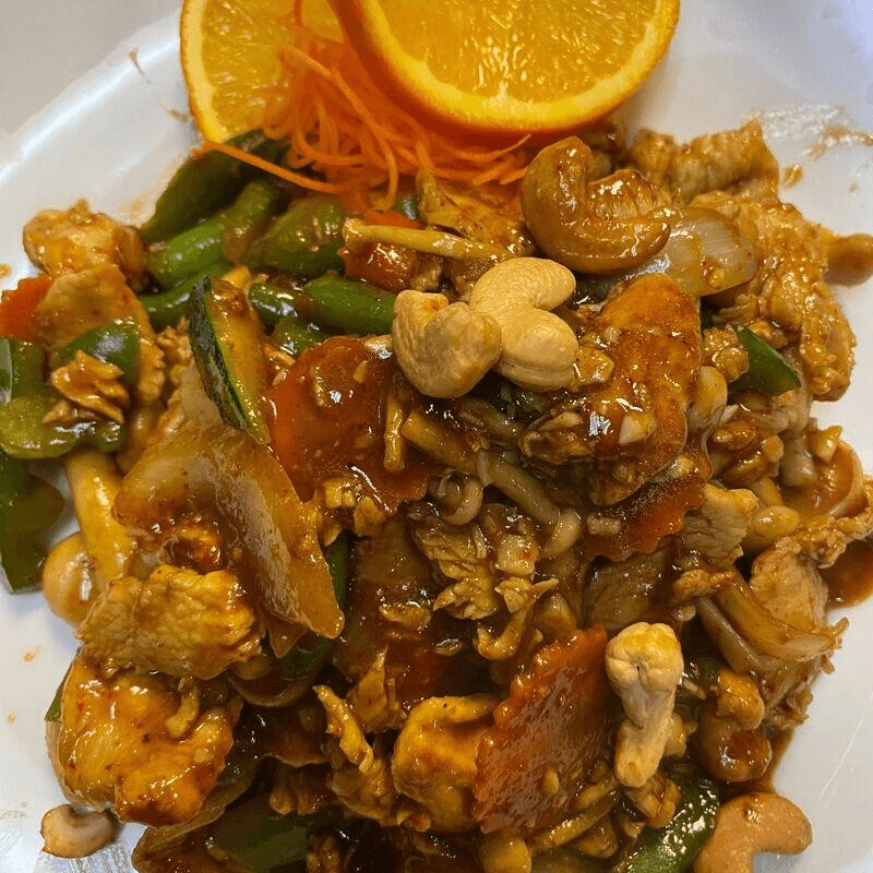 Stir fried garlic, onion, bell pepper, carrots, mushrooms, scallions, chili paste, cashew nuts, and cooking wine in a light brown sauce. 🔥 Spicy