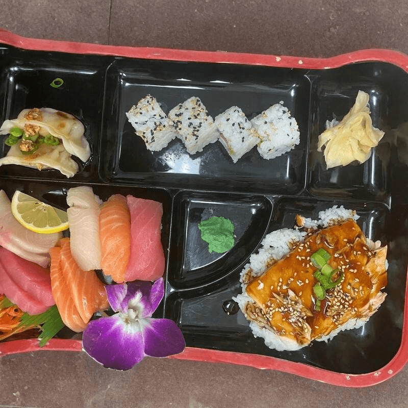 Served raw. 3 pieces of sushi, 6 pieces of sashimi, 4 pieces California roll, 2 gyoza, and salmon teriyaki. Available Monday to Saturday from 11:00 AM to 3:00 PM.