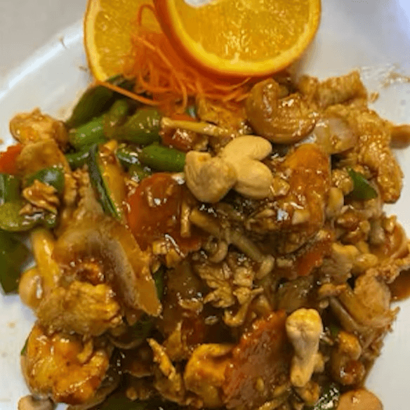 Stir fried garlic, onion, bell pepper, carrots, mushrooms, chili paste and cashew nuts in a light brown sauce. Available Monday to Saturday from 11:00 AM to 3:00 PM.
