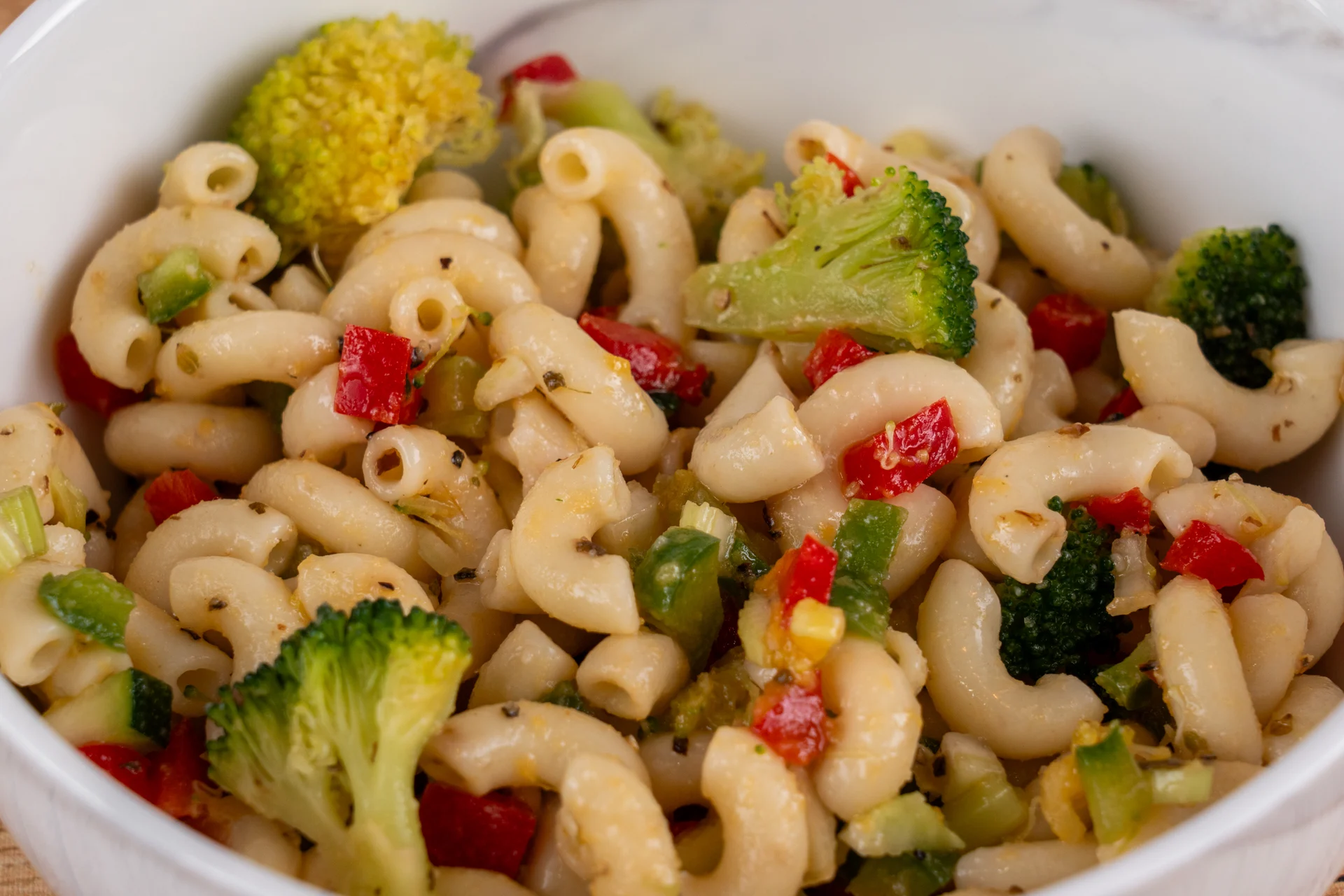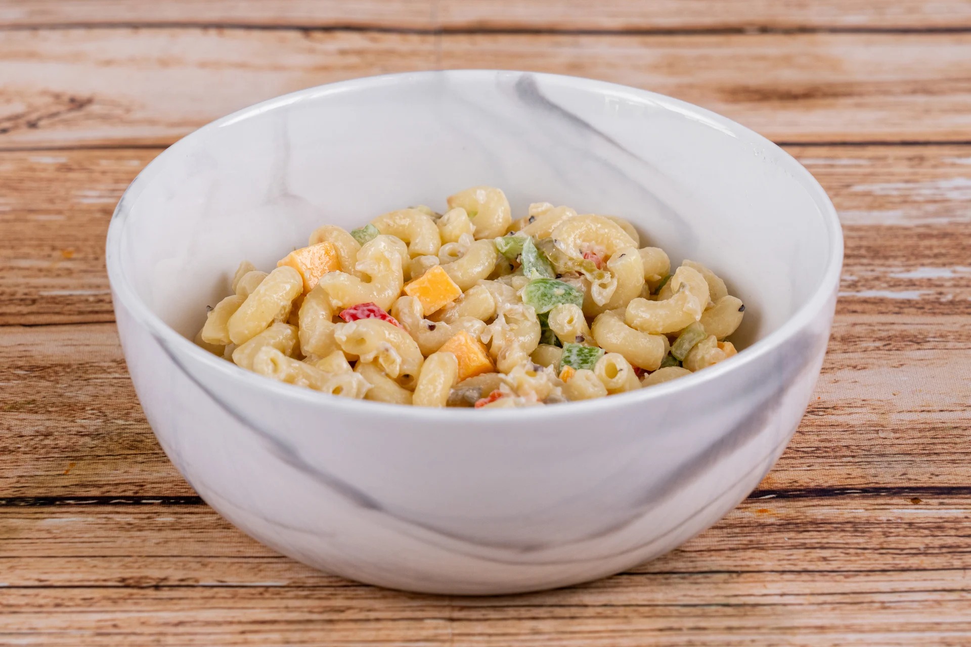 Macaroni tossed in a creamy dressing with cheddar, bell peppers, and crisp veggies