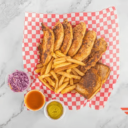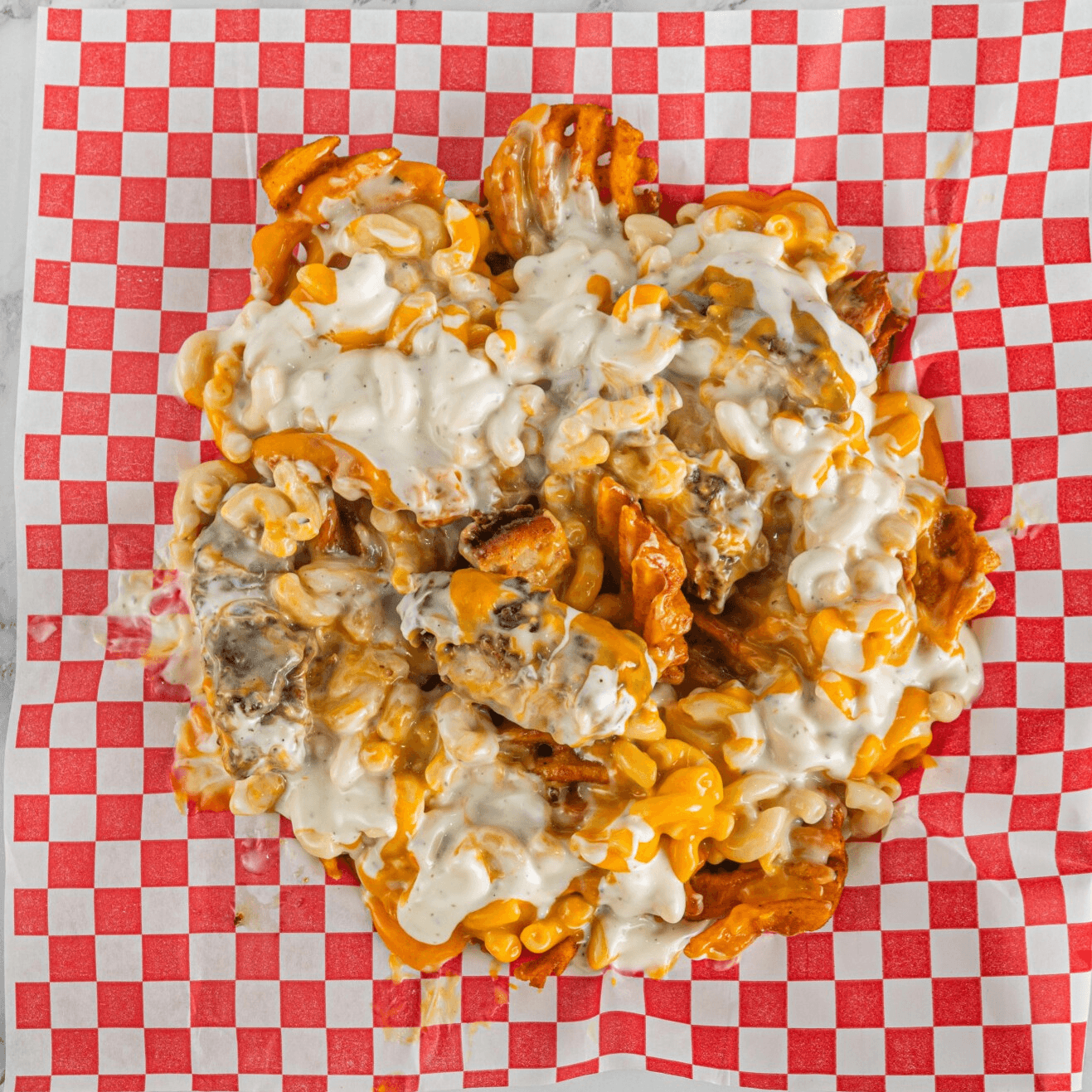 Waffle fries, chopped tenders, mac & cheese, ranch, nacho cheese