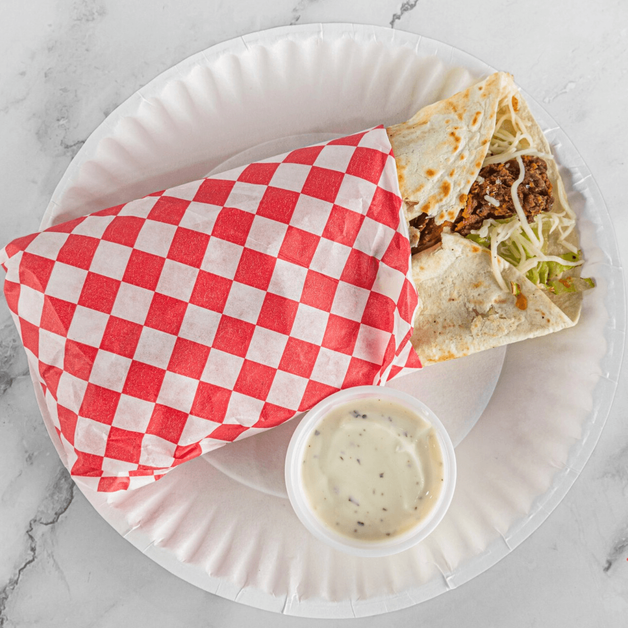 Chicken tender in flour tortilla, shredded lettuce, Monterey jack cheese, ranch