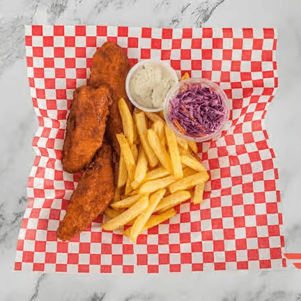 Chicken tender in flour tortilla, shredded lettuce, Monterey jack cheese, served with ranch fries
