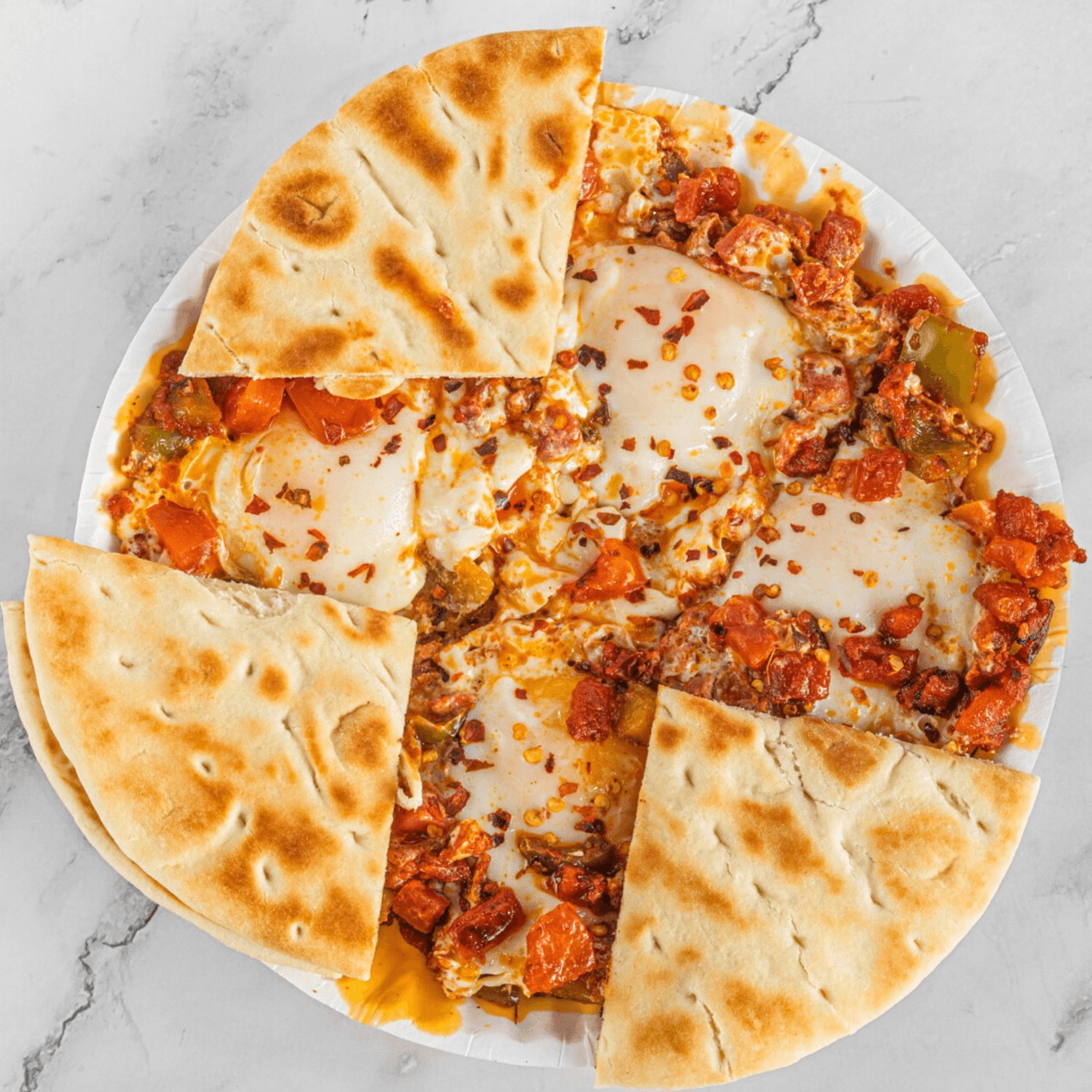 Poached eggs in tomato-bell pepper sauce with spices. Served with pita