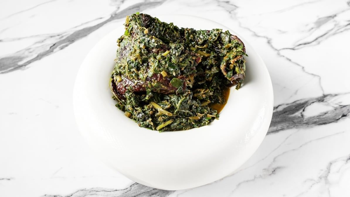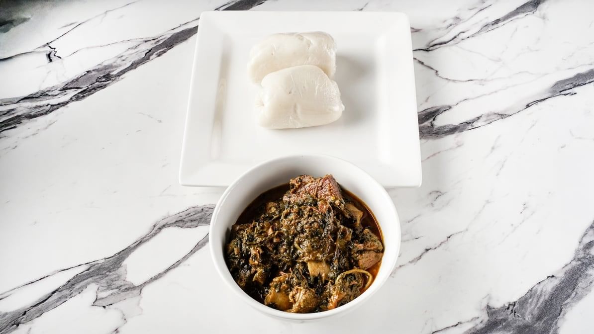 Leafy green soup with choice of beef, goat, fish, assorted meats, or chicken