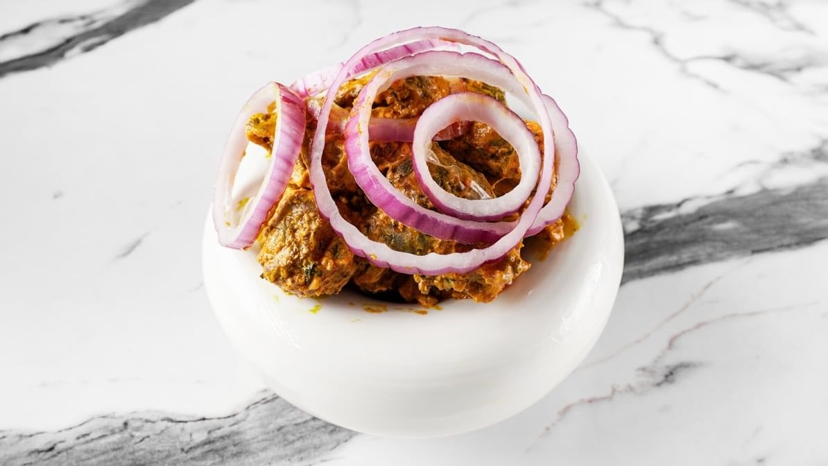Tender goat head pieces seasoned with traditional African spices, garnished with sliced red onions