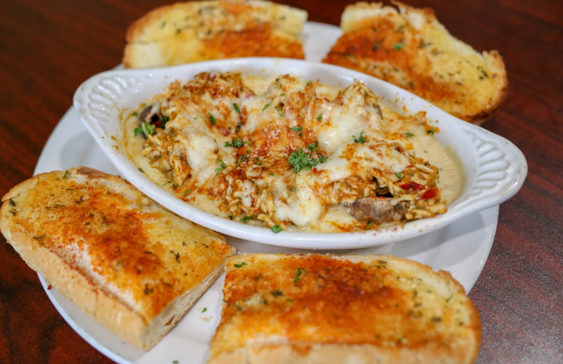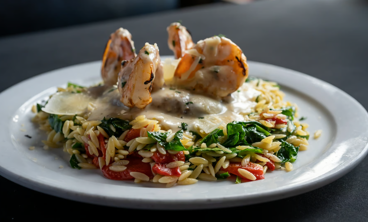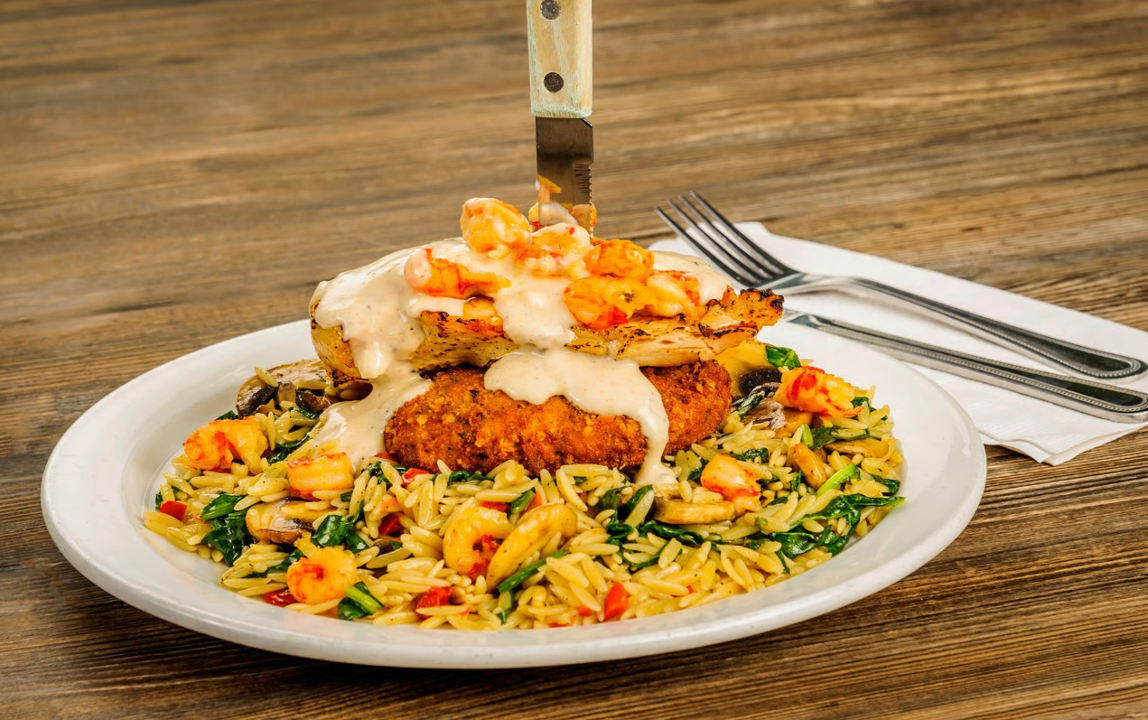 Orzo, crabcake, chicken breast, crawfish, garlic cream sauce.