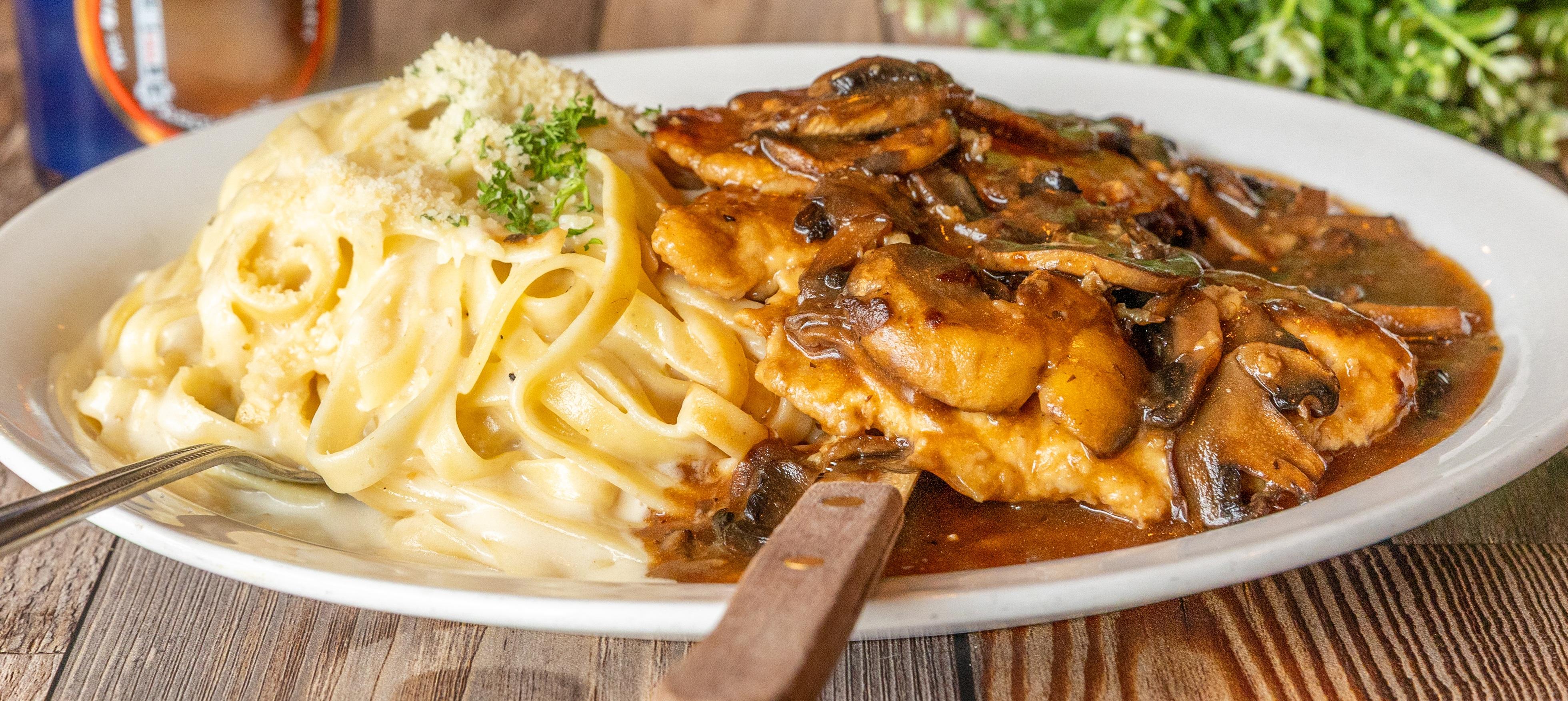Mushrooms, marsala wine sauce, side of fettuccine alfredo.