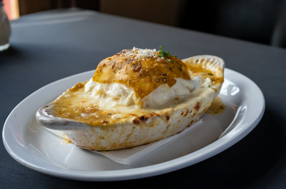 Mushroom caps seafood stuffing garlic cream sauce mozzarella