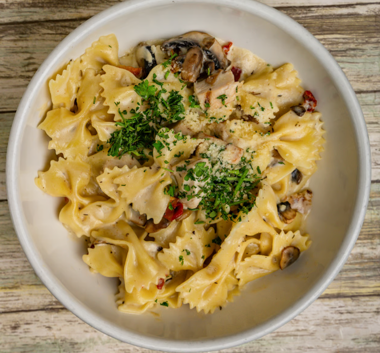 Bowtie, chicken, sundried tomatoes, mushrooms, garlic cream sauce.