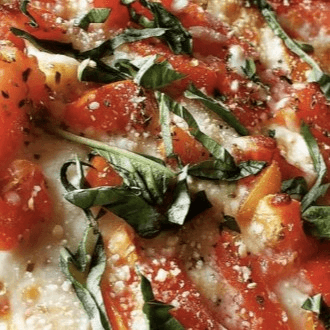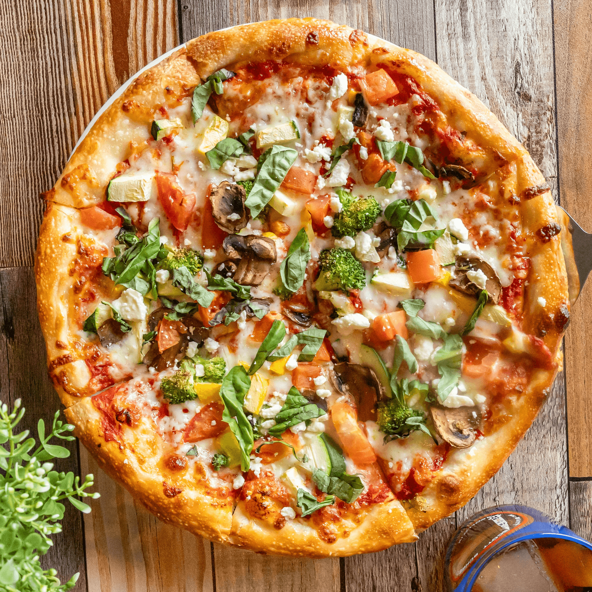 Topped with zucchini, squash, broccoli, tomatoes, and portabella mushrooms, finished with feta and fresh basil.