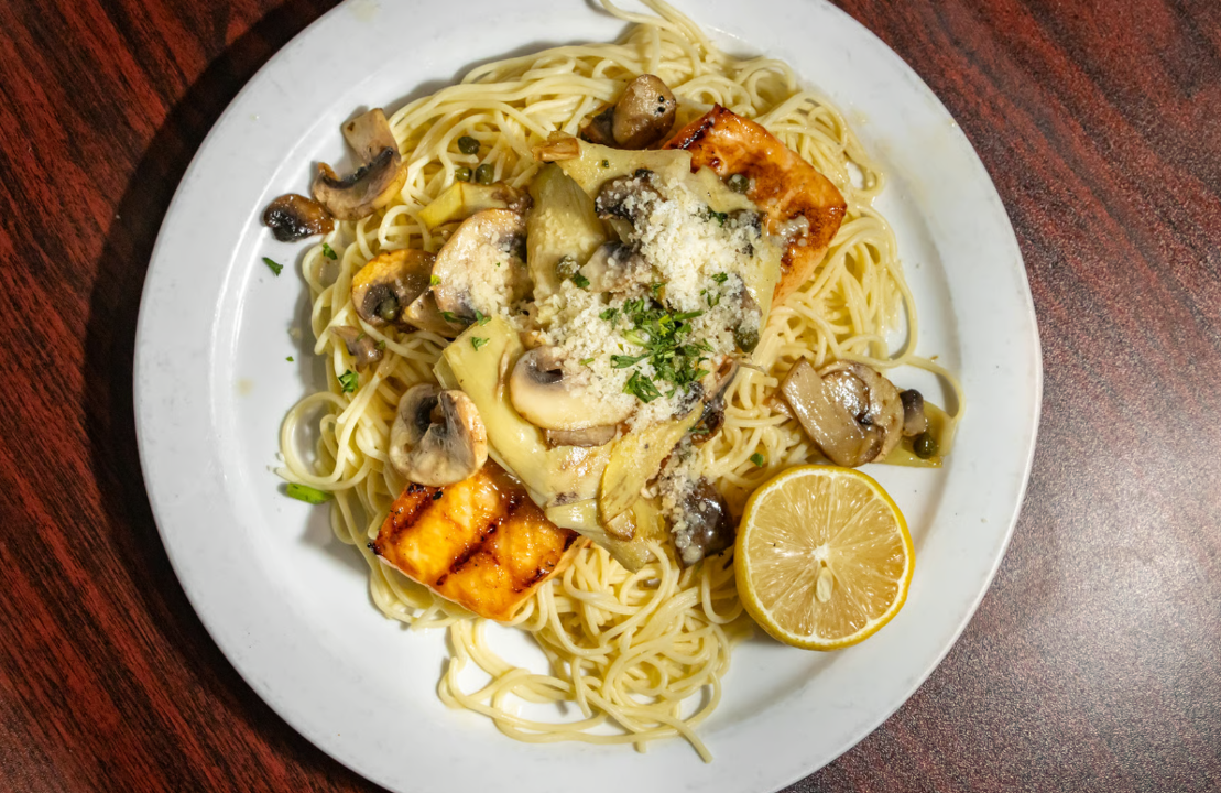 Perfectly grilled 8oz salmon served over angel hair pasta, tossed with artichoke hearts, capers, and mushrooms in our signature lemon butter sauce — bright, rich, and unforgettable.