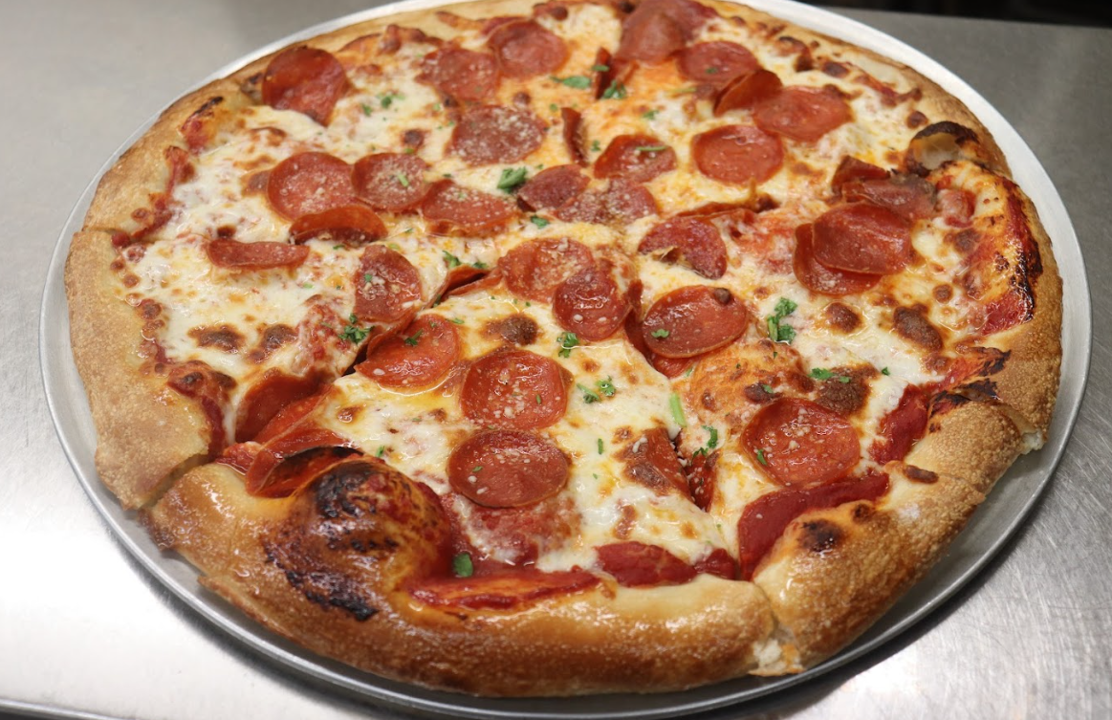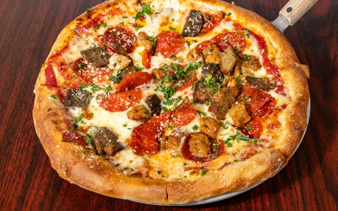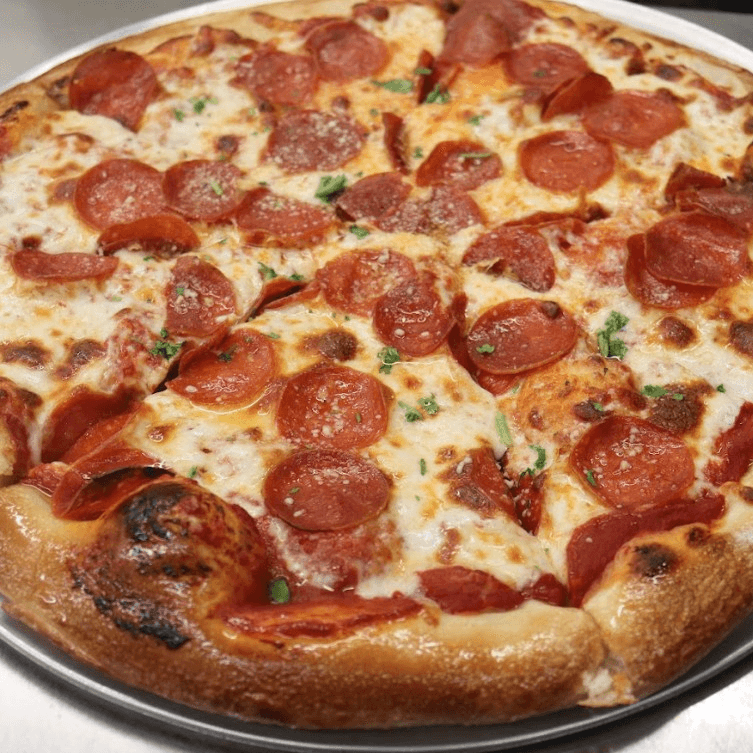Pepperoni, sausage, pizza sauce and five cheese blend.