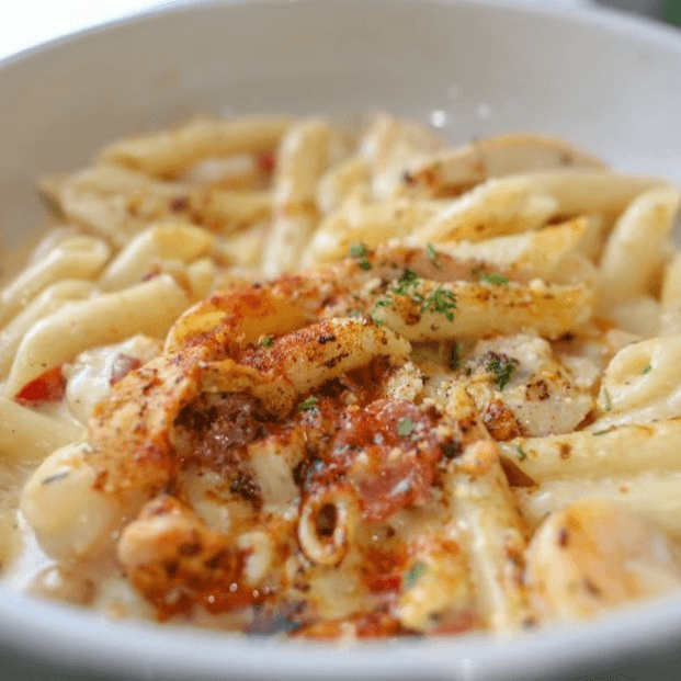 Penne, chicken, shrimp, bacon, red peppers, roasted garlic cream sauce.
