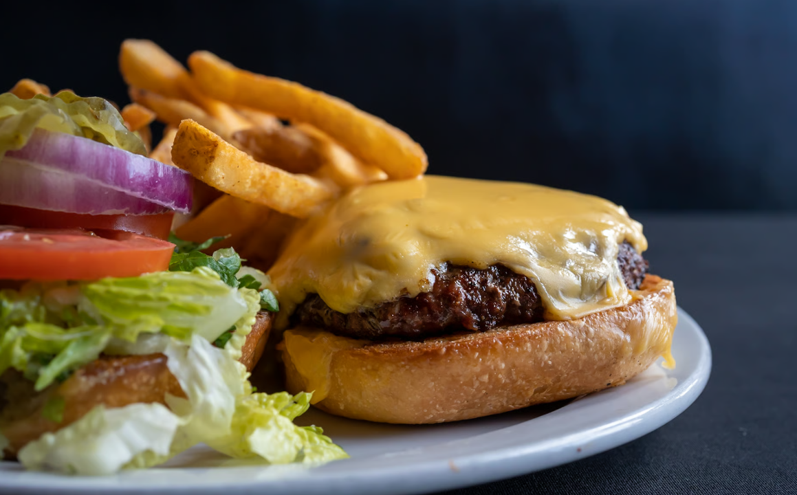 1/2 lb. beef burger, lettuce, tomato, red onion, pickles.