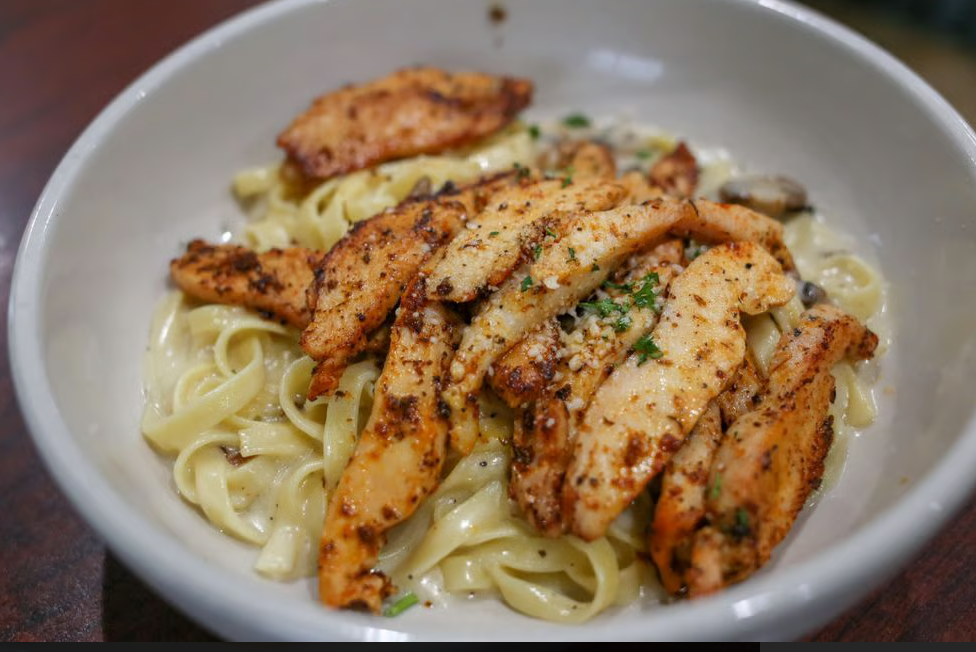 Fettuccine, mushrooms, blackened chicken, alfredo sauce.