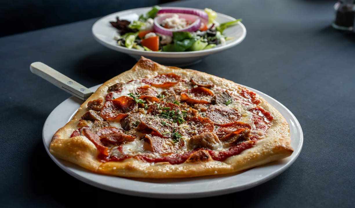 Big slice of The Classic pizza. Side caesar salad or house salad included.