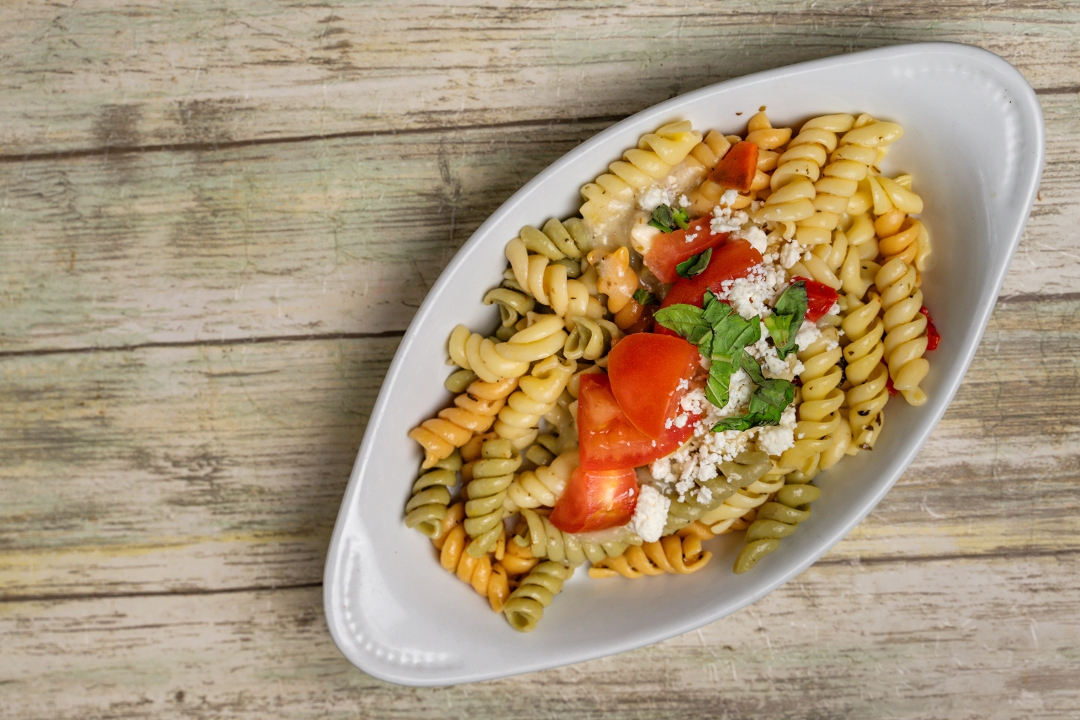 Penne, zucchini, squash, mushrooms, spinach, artichokes, tomatoes, fresh basil, olive oil.