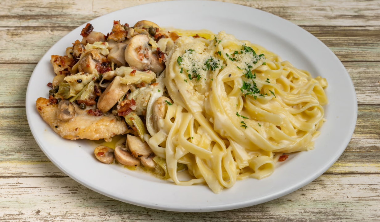 Capers, mushrooms, artichokes & smoked bacon, lemon butter, side of fettuccine alfredo.