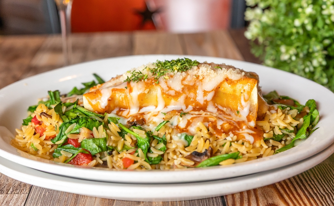 One cannelloni, chicken, spinach, sundried tomatoes, ricotta & mozzarella cheese, orzo, chipotle alfredo.
