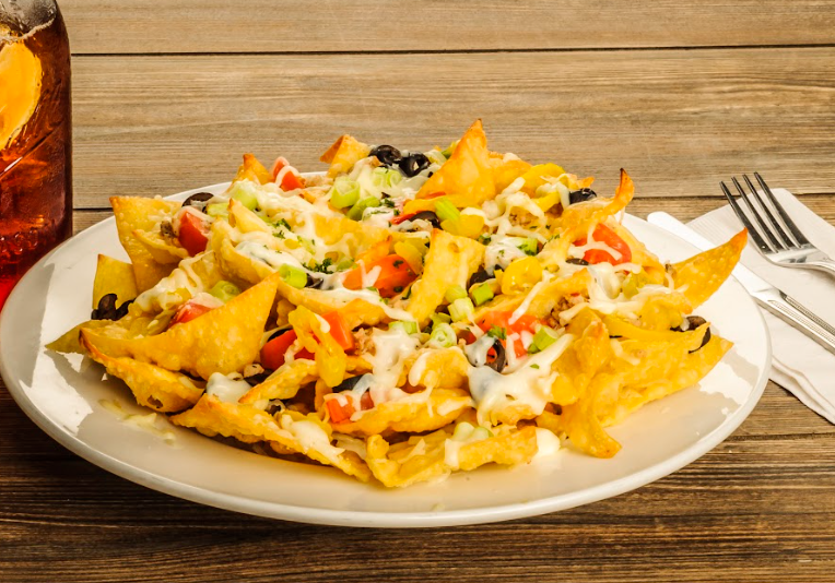 Won Ton chips topped with alfredo sauce, Italian sausage, mozzarella & parmesan cheese, tomatoes, black olives, green peppers & banana peppers.