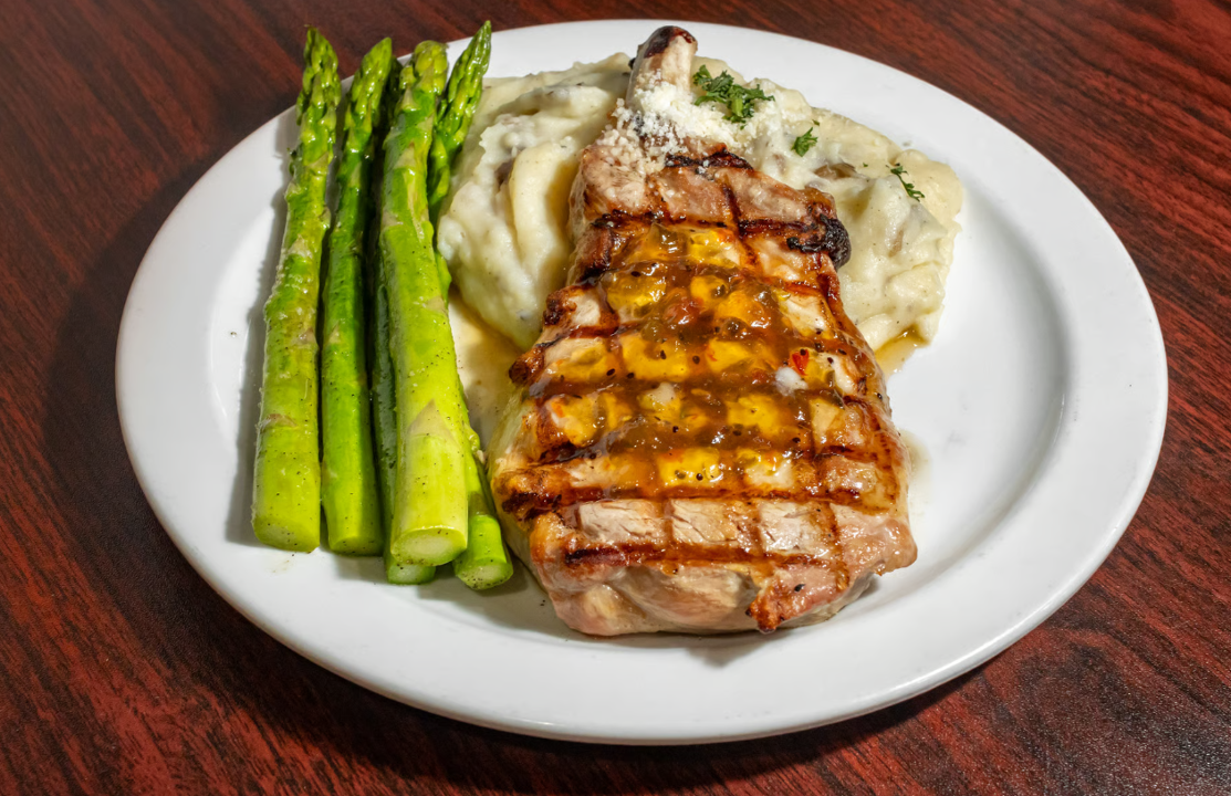 A ten ounce chop, jalapeno, kiwi glaze, garlic mashed potatoes, sauteed asparagus.