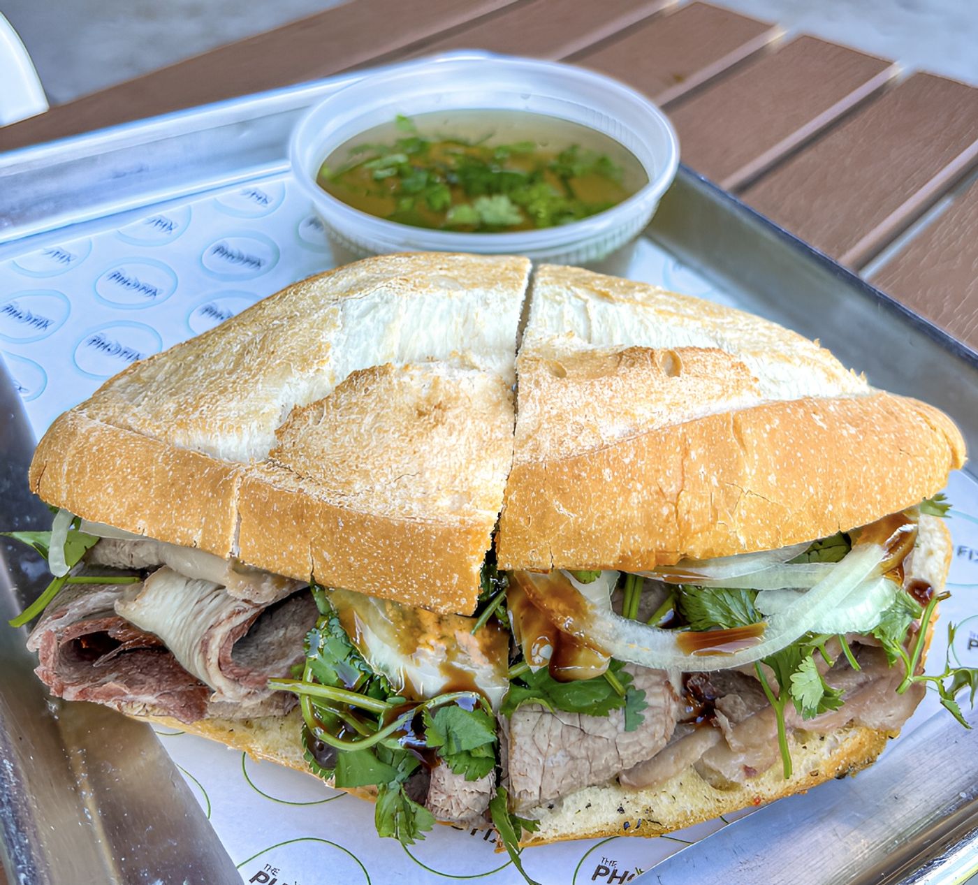 Brisket, bone marrow butter, basil, cilantro, onion, spicy aioli, hoisin, side of beef broth.