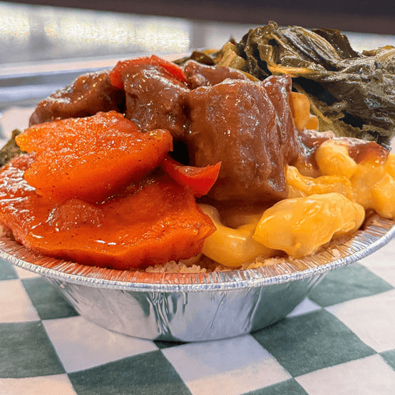 Experience the best soul food bowl in Houston at Mikki’s! This hearty bowl features a homemade cornbread bottom crust loaded with our award-winning mac & cheese, candied yams, and collard greens, all topped with tender smothered beef tips. It’s the ultimate southern comfort meal in one bowl. Order this signature Mikki's Bowl online now!