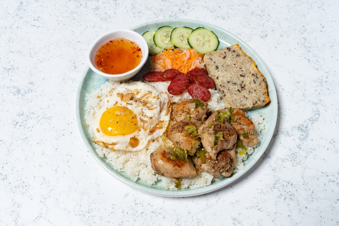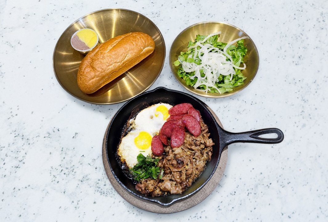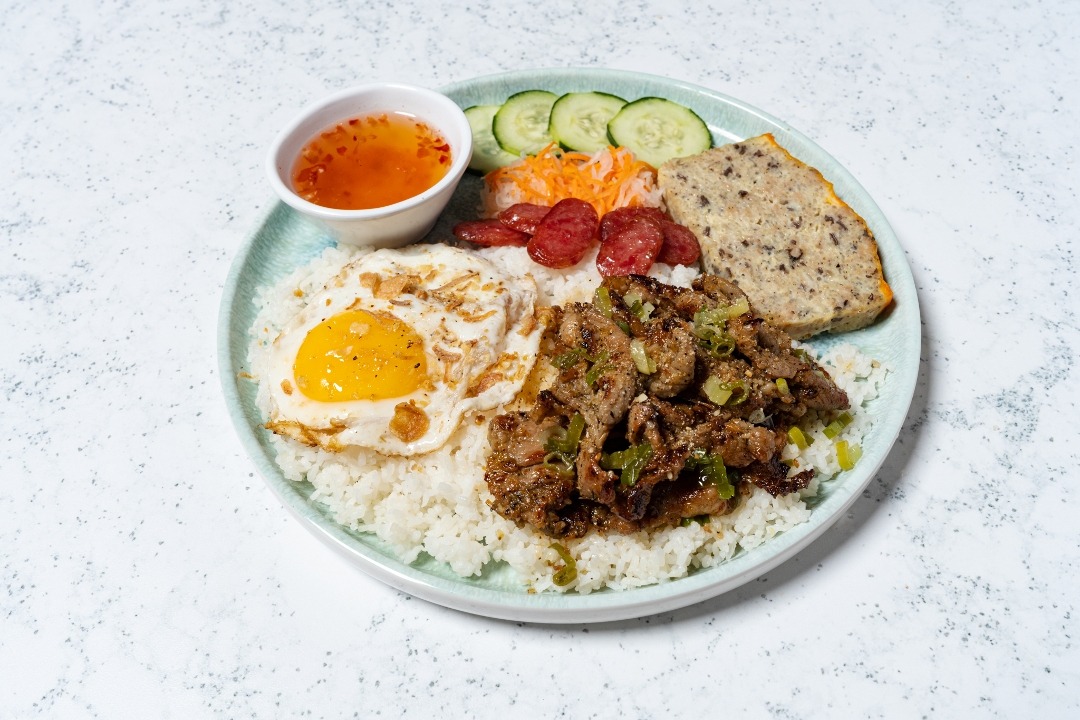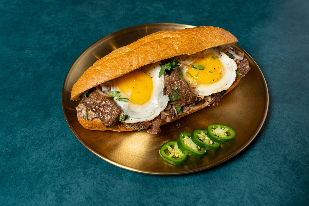 Vietnamese steak and eggs, pork sausage, toasted baguette and side salad. Served with pate and Vietnamese mayo.
