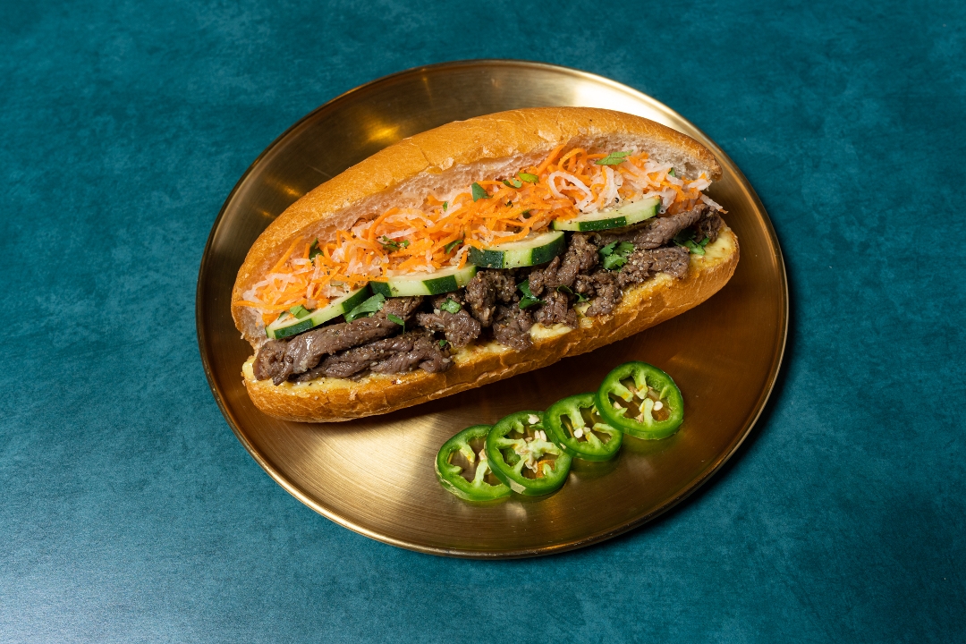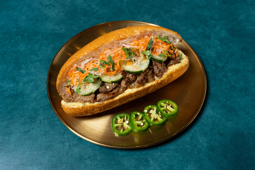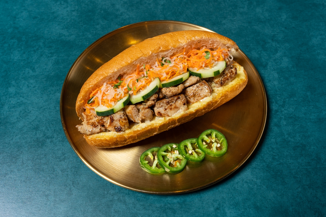 Served on french bread with Vietnamese mayo, pickled daikon/carrots, cucumbers, jalapenos, and cilantro.