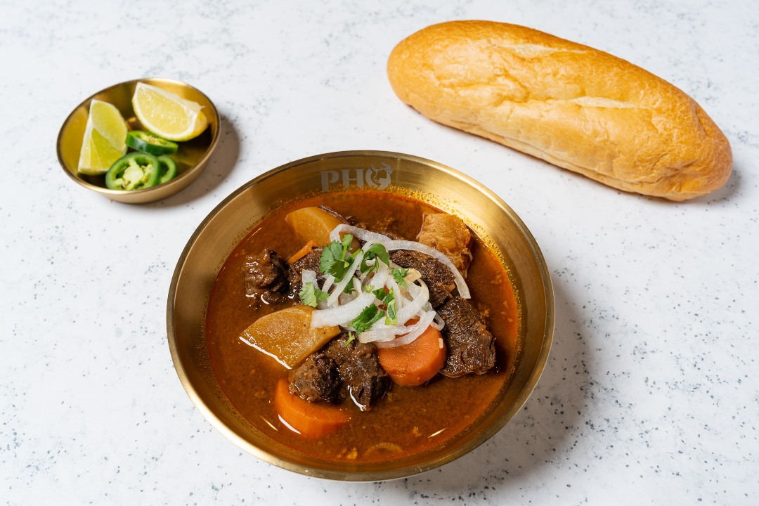 12-hour braised brisket and tendon stew with carrotsand daikon. Choice of pho noodles or bread for dipping.