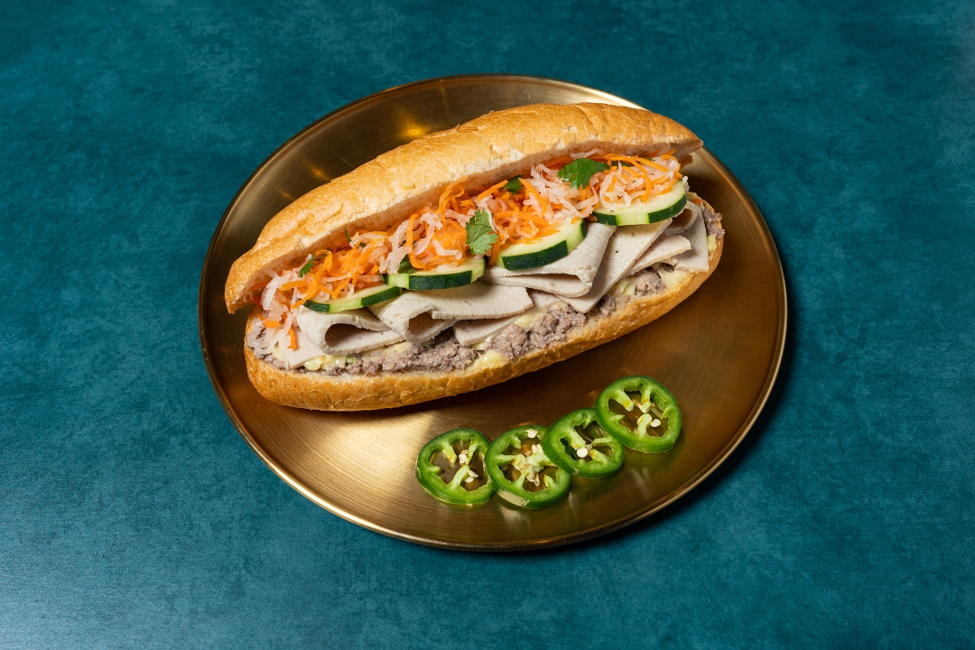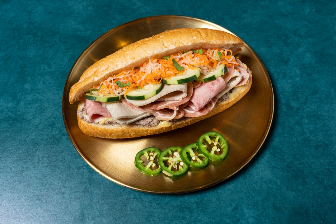 Cold cut banh mi with Vietnamese ham, jambon, head cheese, pate, and Vietnamese mayo. Also comes with pickled daikon/carrots, cucumbers, cilantro, and jalapenos on the side.