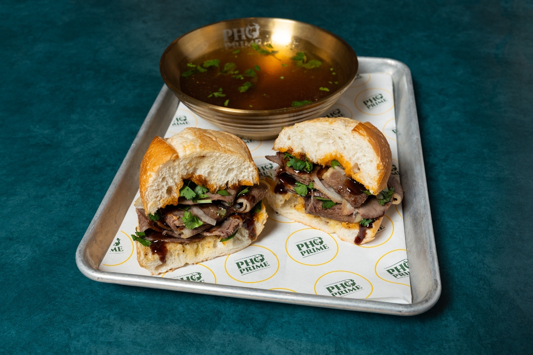 10 hour smoked Gatlin's brisket, garlic herb butter, spicy aioli, herbs, pickled red onion, toasted bolillo. Served with our signature pho broth for dipping.