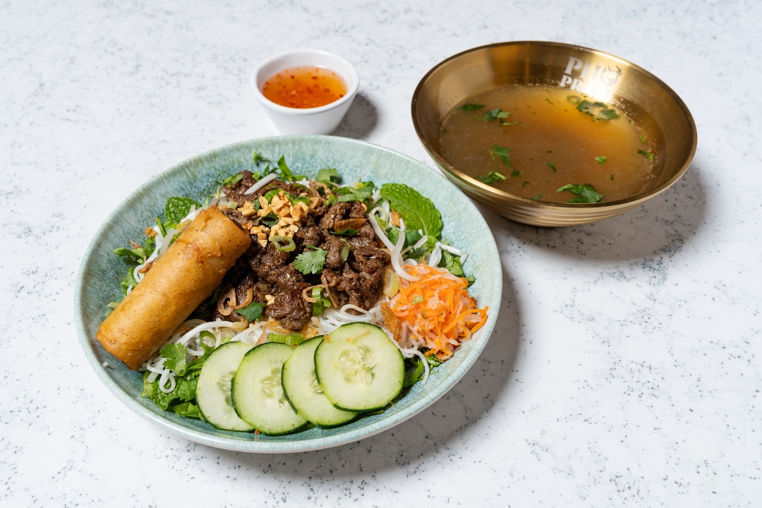 Honey lemongrass beef, shrimp & pork eggroll, vermicelli noodles, veggies and a side of chicken broth. *This dish contains peanuts.