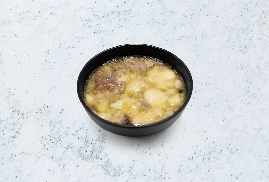 Lemongrass honey glazed beef, pork sausage, egg meatloaf, fried egg, and a side of chicken broth.