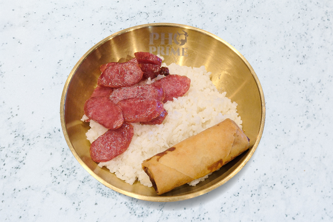 Broken jasmine rice, chinese pork sausage, (1) shrimp and pork eggroll