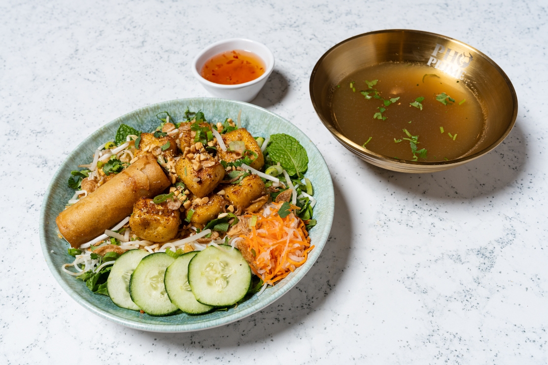 Honey lemongrass tofu, shrimp & pork eggroll, vermicelli noodles, veggies and a side of chicken broth. *This dish contains peanuts.