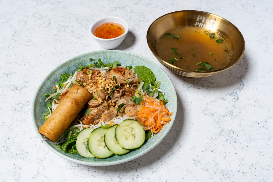 Honey lemongrass pork, shrimp & pork eggroll, vermicelli noodles, veggies and a side of chicken broth. *This dish contains peanuts.