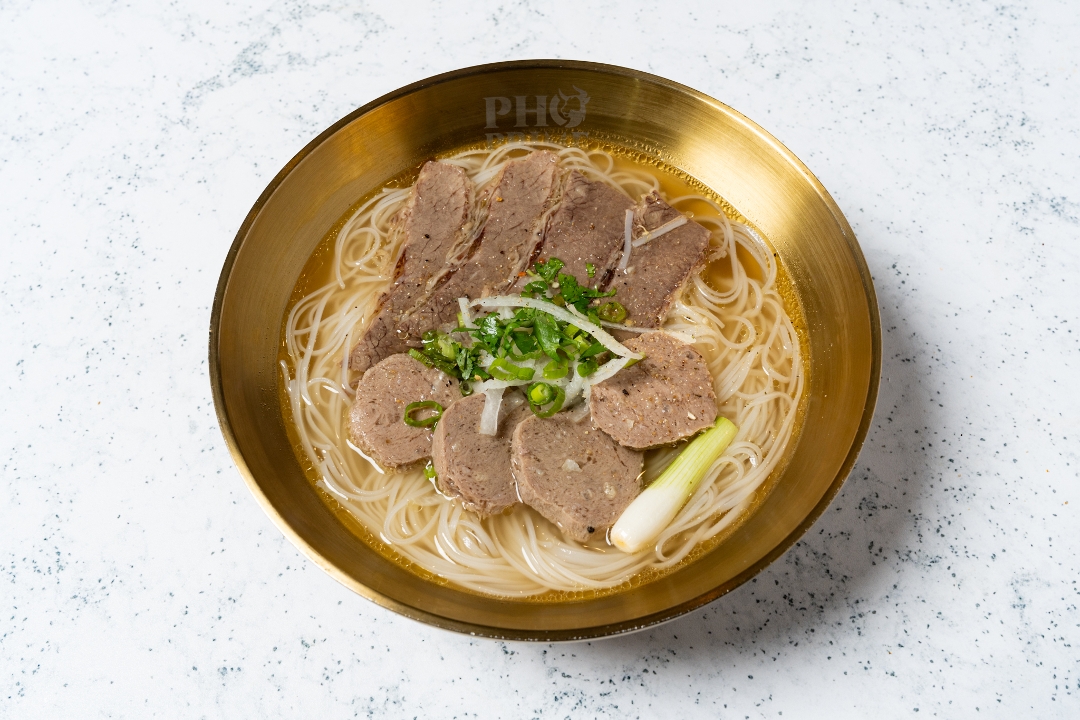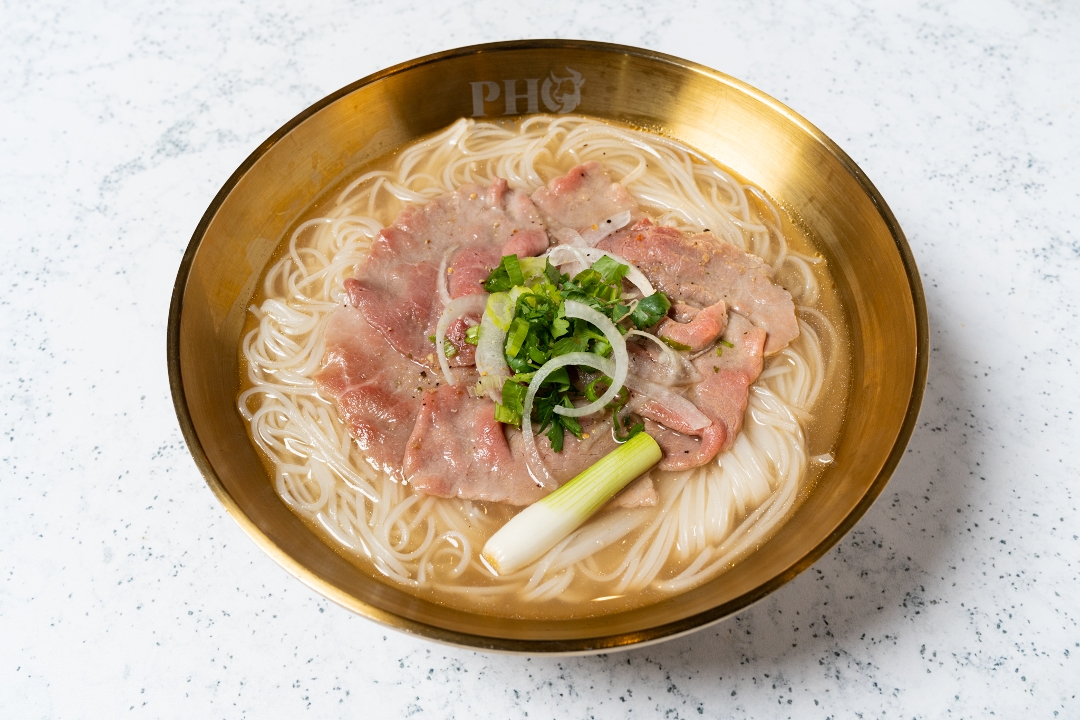 Beef broth, eye round rare steak *Eye round is served rare and is intended to be cooked by pouring boiling hot broth over. *All pho bowls come with green onions, yellow onions, and cilantro. Bean sprouts, basil, lime, and jalapenos will be on the side.