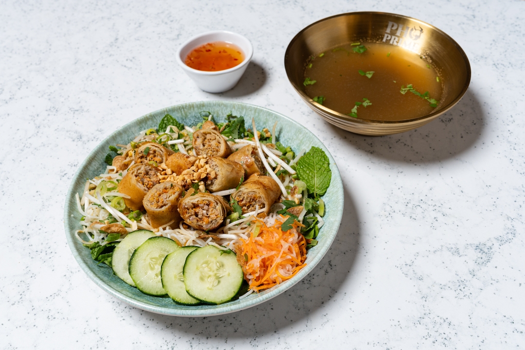Shrimp & pork eggrolls, vermicelli noodles, veggies and a side of chicken broth. *This dish contains peanuts.