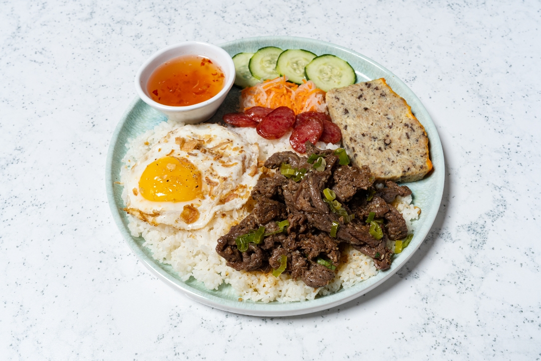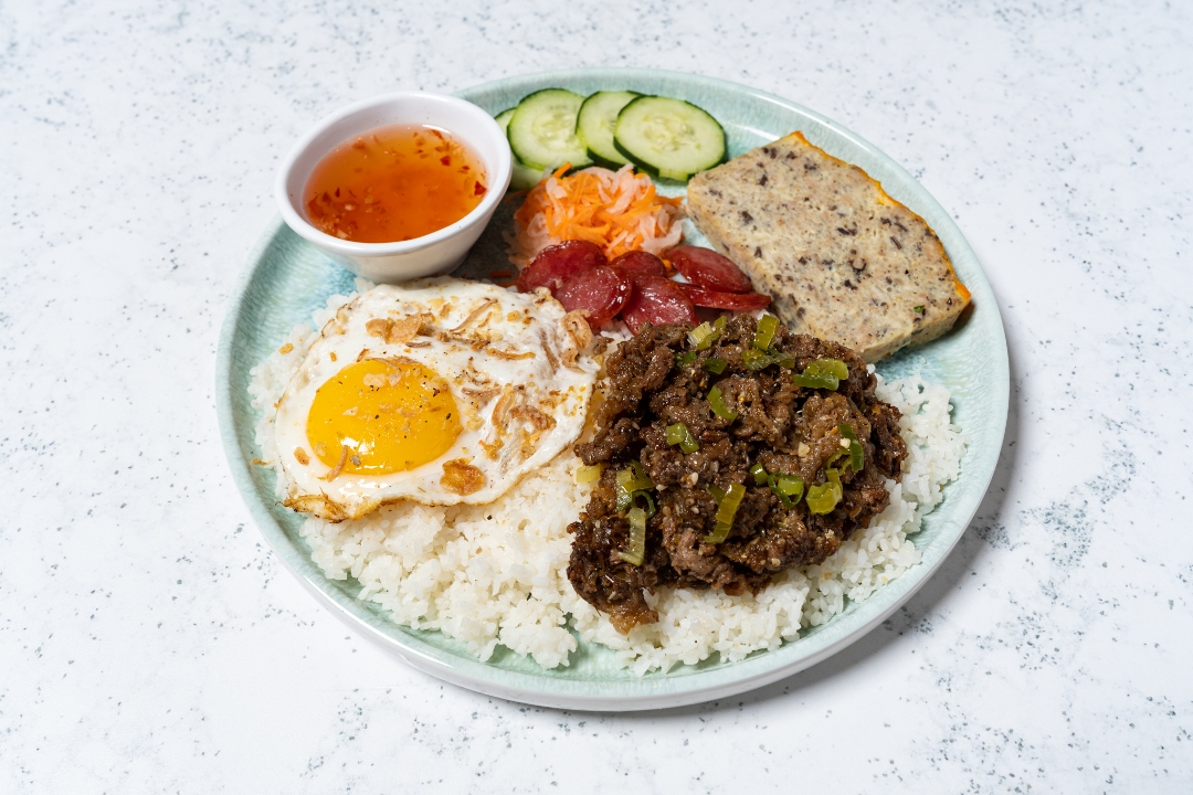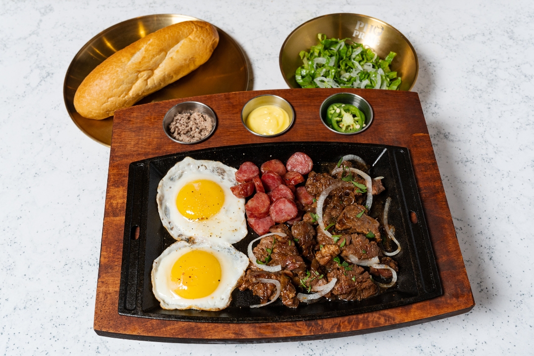 Steak cubes, sunny-side up eggs, pate, Vietnamese mayo