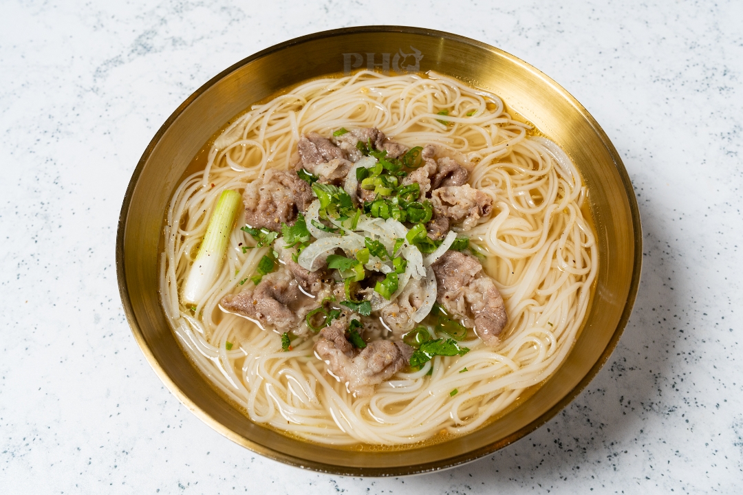 Beef broth, thin-sliced beef belly *All pho bowls come with green onions, yellow onions, and cilantro. Bean sprouts, basil, lime, and jalapenos will be on the side.