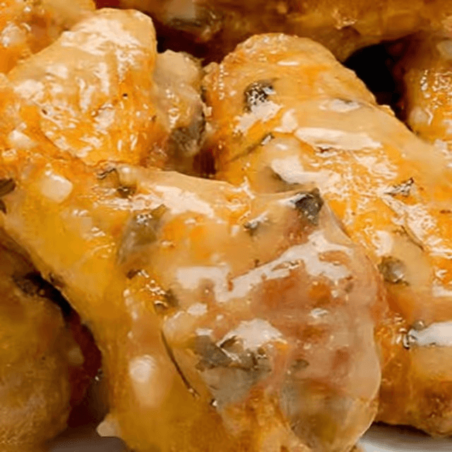 Fried chicken winglets dipped in butter and garlic sauce and sprinkled with Parmesan cheese, served with seasoned fries or onion rings. With your choice of dipping sauce.