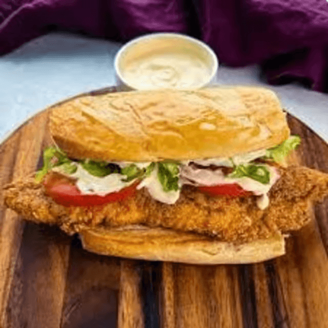 Fried catfish served on a po'boy bun with lettuce and tomatoes, with your choice of French fries or onion rings.